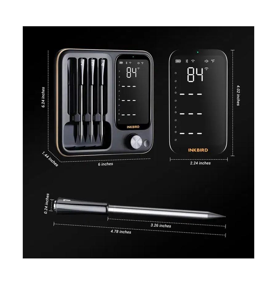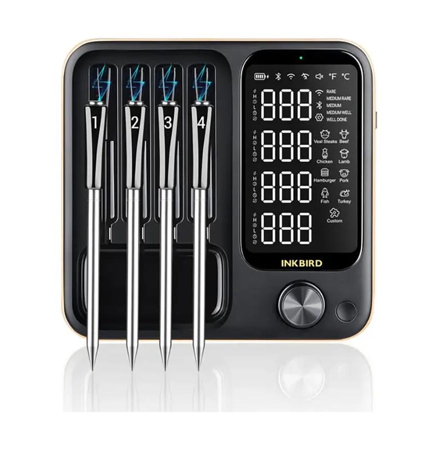 מדחום מתקדם מבית Inkbird, הכולל 4 פרובים אלחוטיים, קישוריות כפולה (WiFi ו-Bluetooth), וסוללה נטענת עם בסיס חכם בעל מסך LCD.