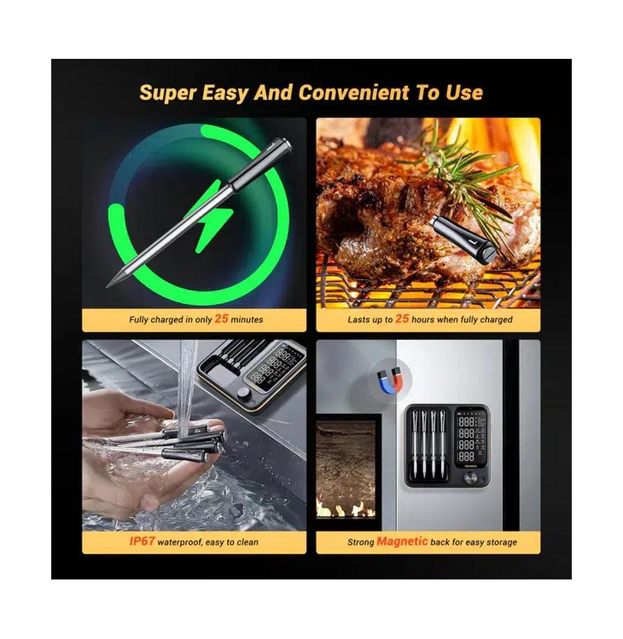 • 4 פרובים אלחוטיים מדויקים מנירוסטה, עמידים במים בתקן IP67 ומתאימים לניקוי במדיח.