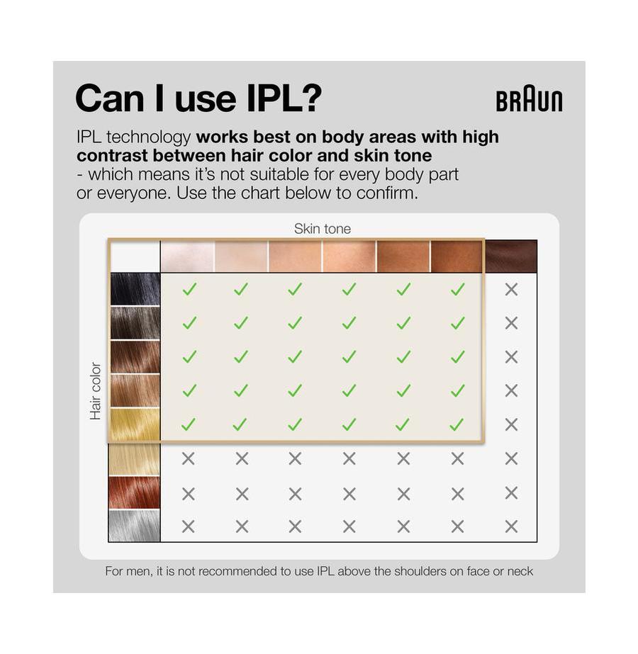 מכשיר ה-IPL של Braun מתאים למגוון רחב של גווני עור – מעור בהיר ועד בינוני-כהה – ומתאים לבעלי שיער טבעי בגוונים שבין בלונדיני לחום כהה או שחור. עם זאת, היעילות של הטכנולוגיה נמוכה יותר עבור שיער עם ריכוז נמוך של פיגמנט מלנין, כמו שיער בלונדיני בהיר מאוד, ג’ינג’י, אפור או לבן.