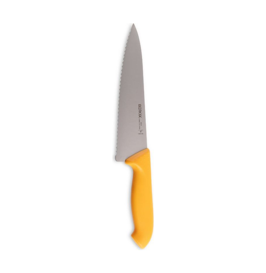 סכין שף משוננת של BEROX מותאמת למקצוענים ולמשתמשים ביתיים כאחד. עם להב מפלדת אל-חלד ובאורך 21 ס"מ, היא מספקת חיתוך מדויק ונוח לירקות, בשר ודגים. בזכות עמידותה והאחריות ל-10 שנים, קבלת מוצר איכותי מובטחת. היא קיימת במגוון צבעים, ומגיעה עם המלצות לטיפול וניקוי לשימוש מתמשך ובטוח.
